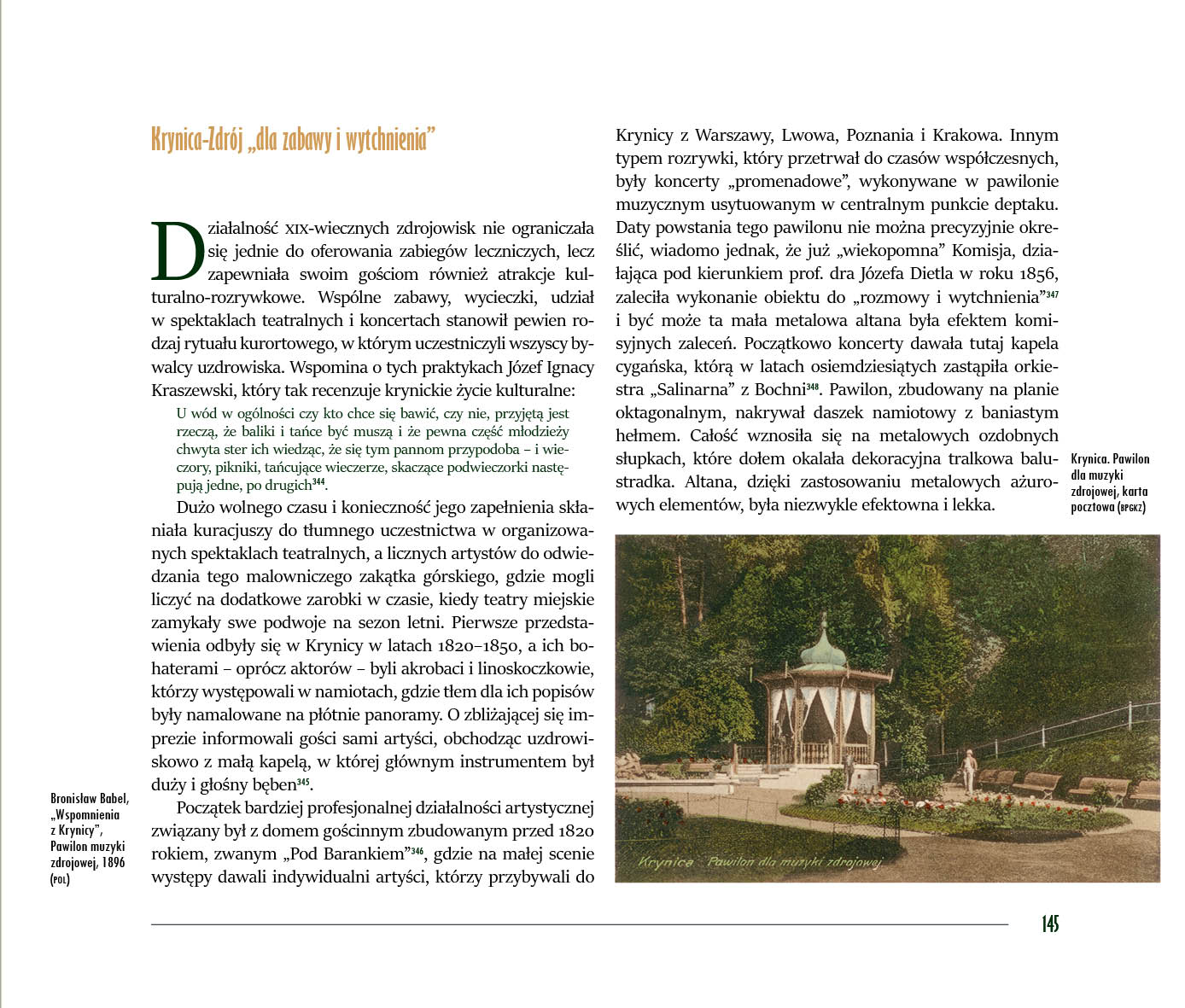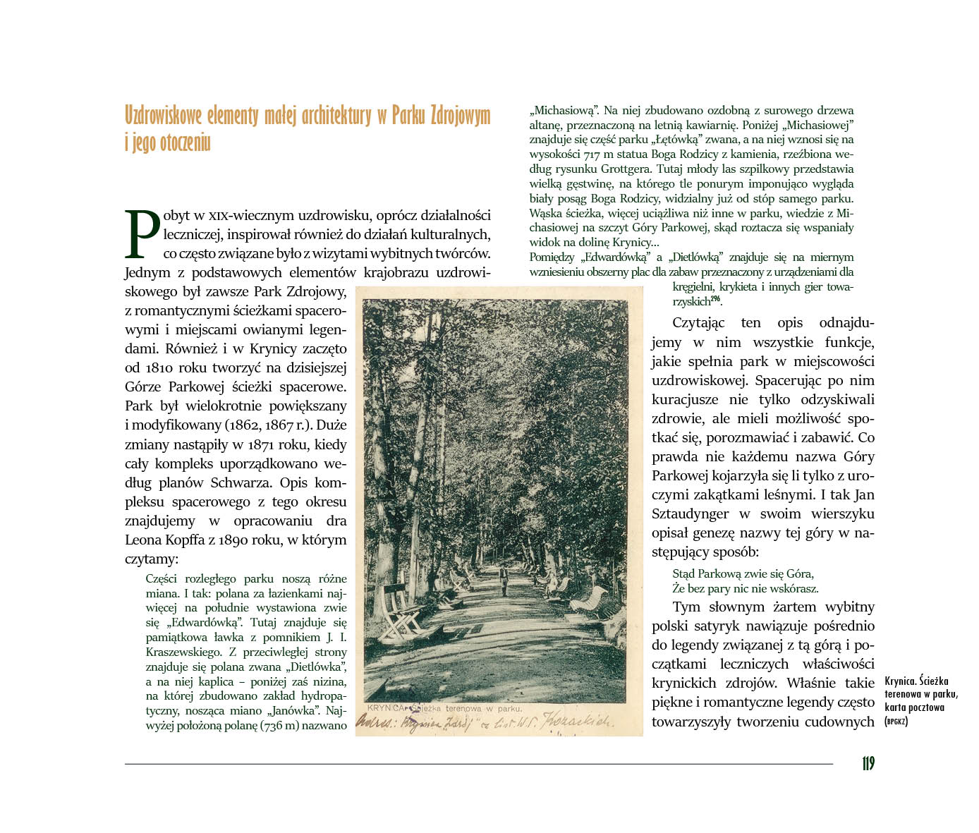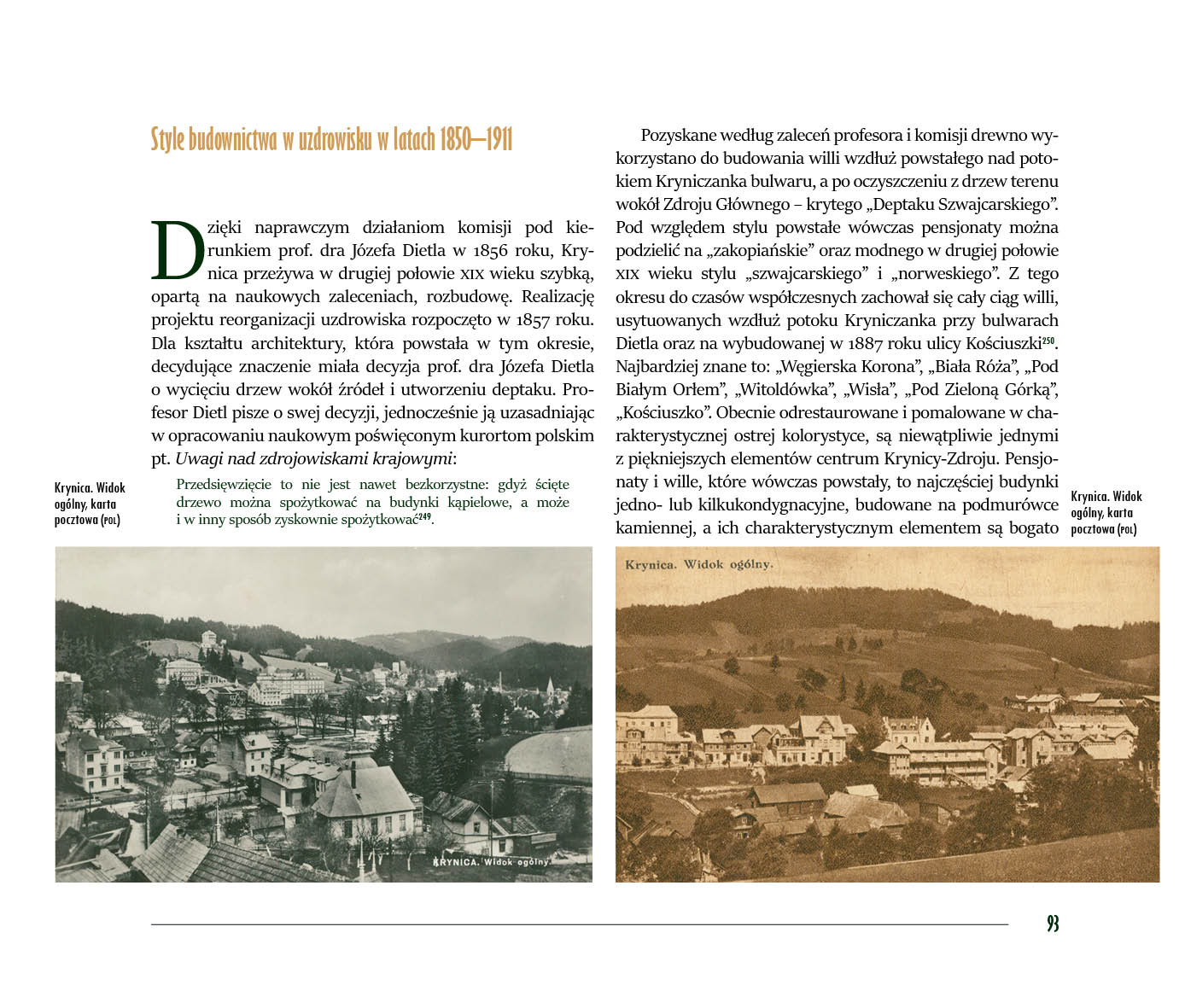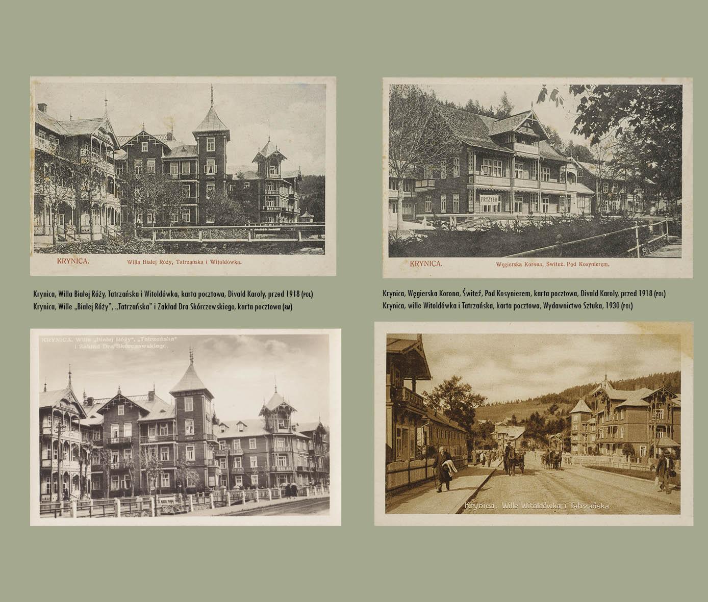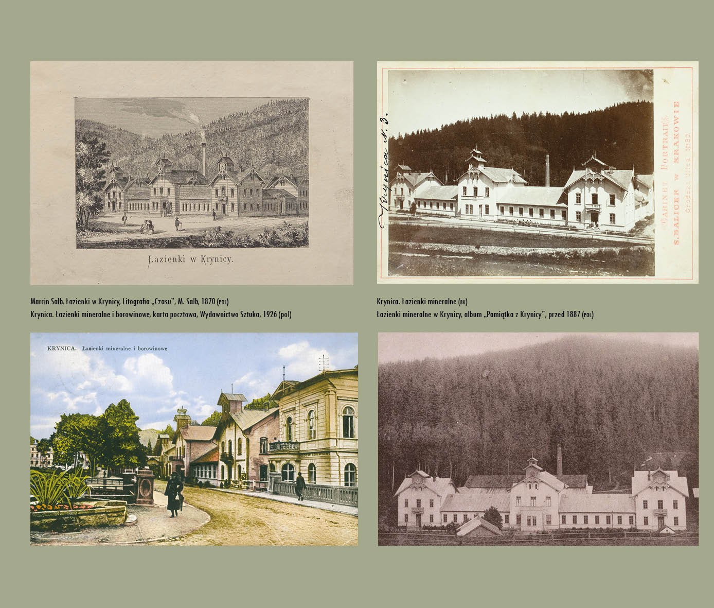 Album, który trzymają Państwo w ręce, po raz pierwszy prezentuje tak szeroki i bogaty wybór przedstawień Krynicy, począwszy od xix-wiecznych map ukazujących drogi do Krynicy, map samej Krynicy, xix-wiecznych rycin i litografii, poprzez wizje malarzy, fotografików, na niezwykłych zdjęciach z xx wieku oraz współczesnych fotografiach kończąc. Każdy rozdział to oddzielna historia zaklęta w obrazach, fotografiach, pocztówkach, litografiach, mapach – to kopalnia wiadomości o Krynicy.