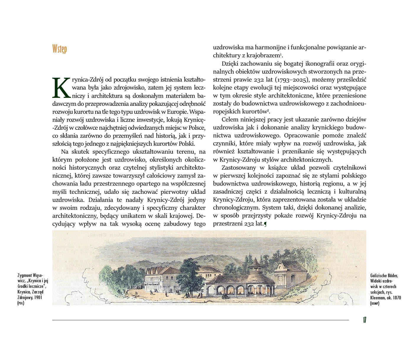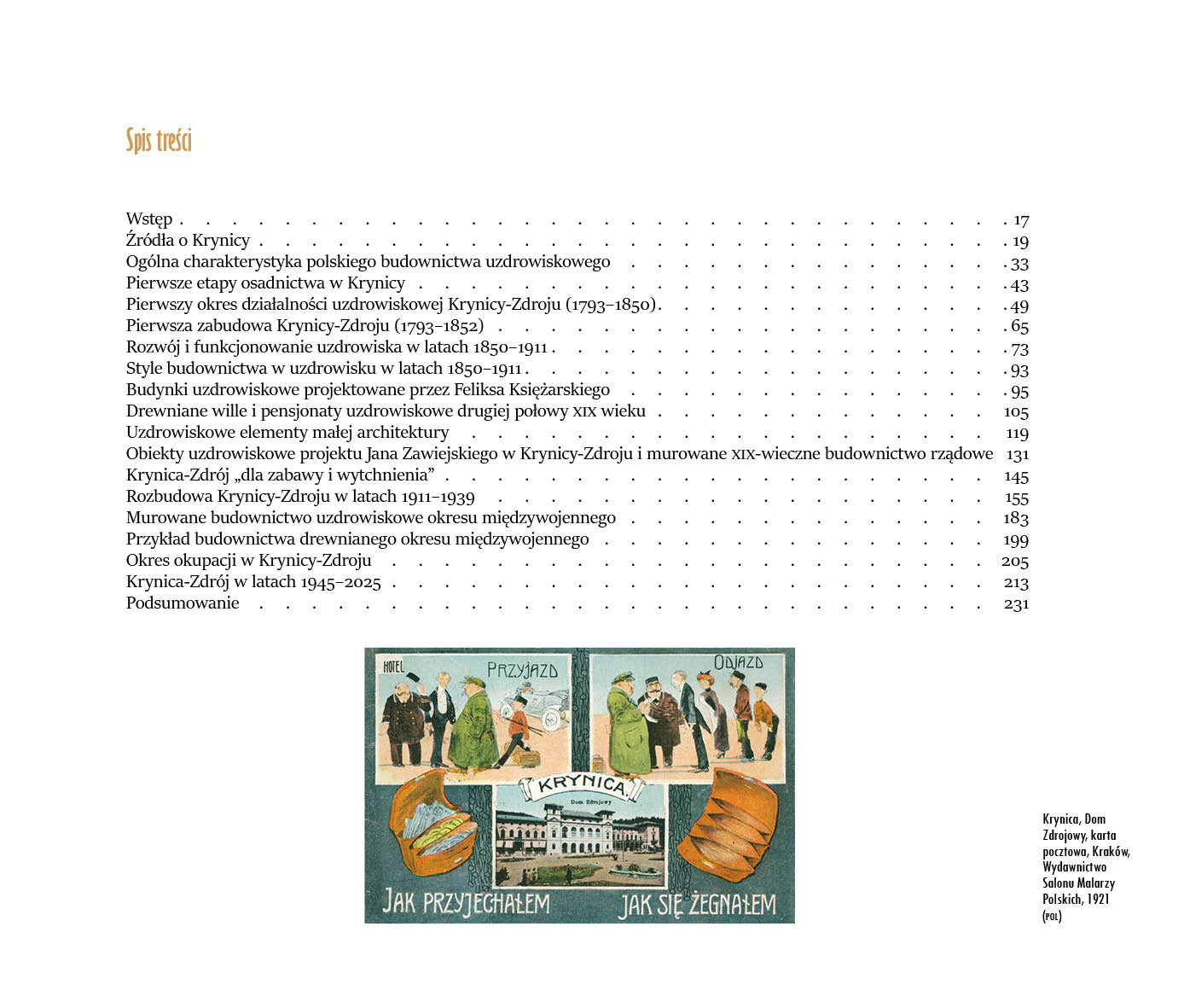 Zastosowany w książce układ pozwoli czytelnikowi w pierwszej kolejności zapoznać się ze stylami polskiego budownictwa uzdrowiskowego, historią regionu, a w jej zasadniczej części z działalnością leczniczą i kulturalną Krynicy-Zdroju, która zaprezentowana została w układzie chronologicznym. System taki, dzięki dokonanej analizie, w sposób przejrzysty pokaże rozwój Krynicy-Zdroju na przestrzeni 232 lat.¶
