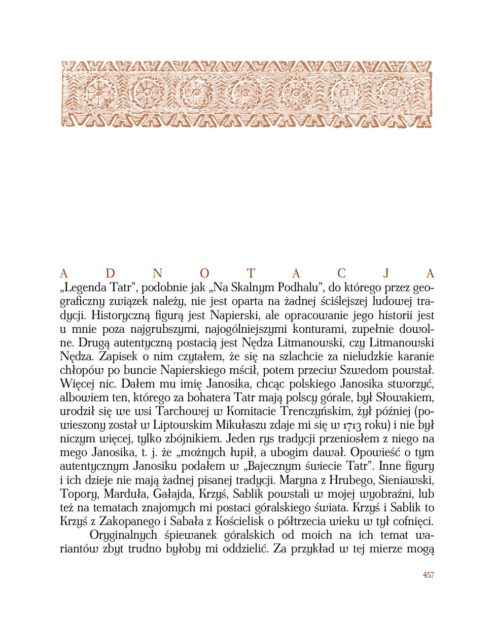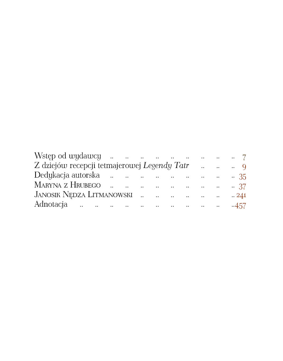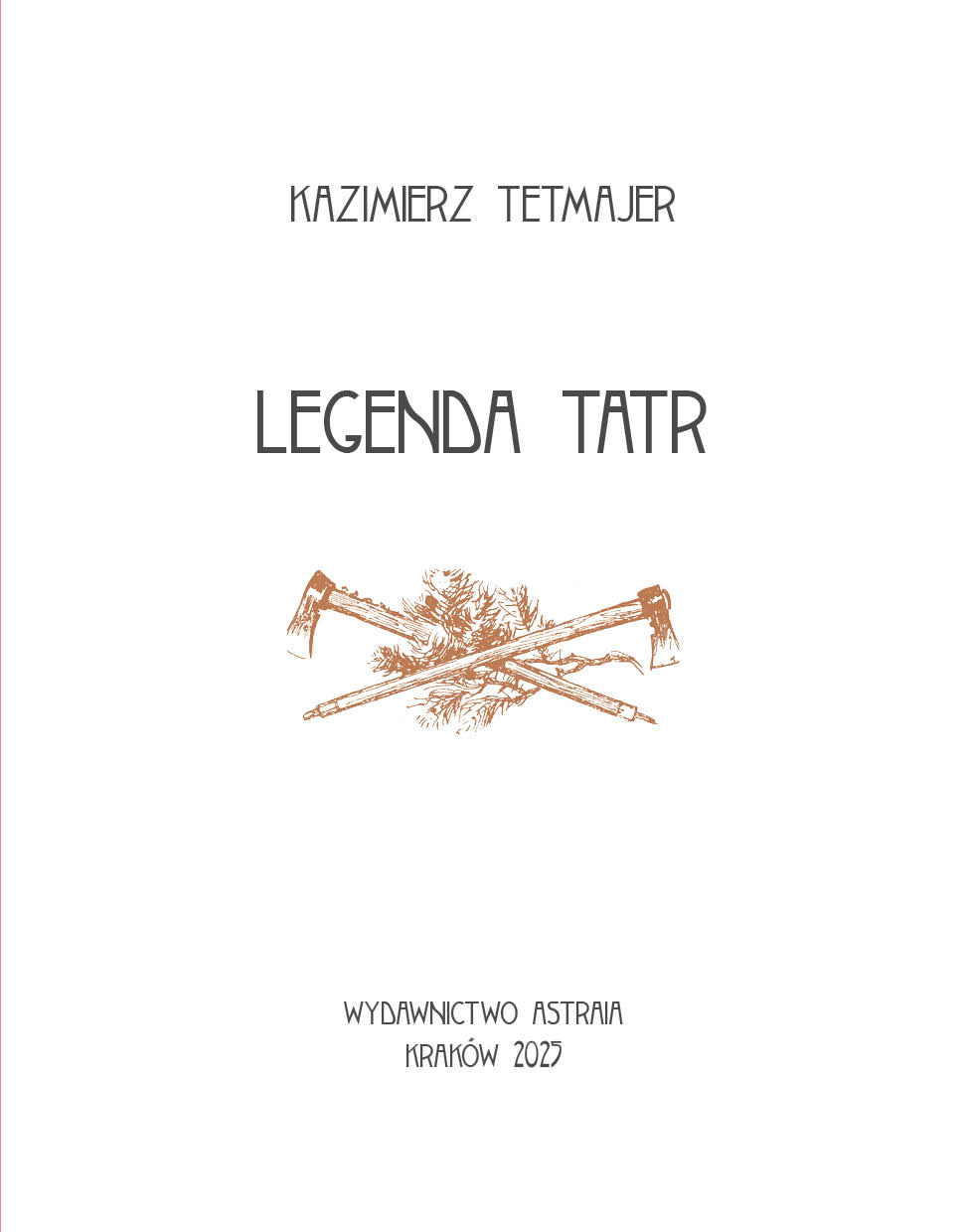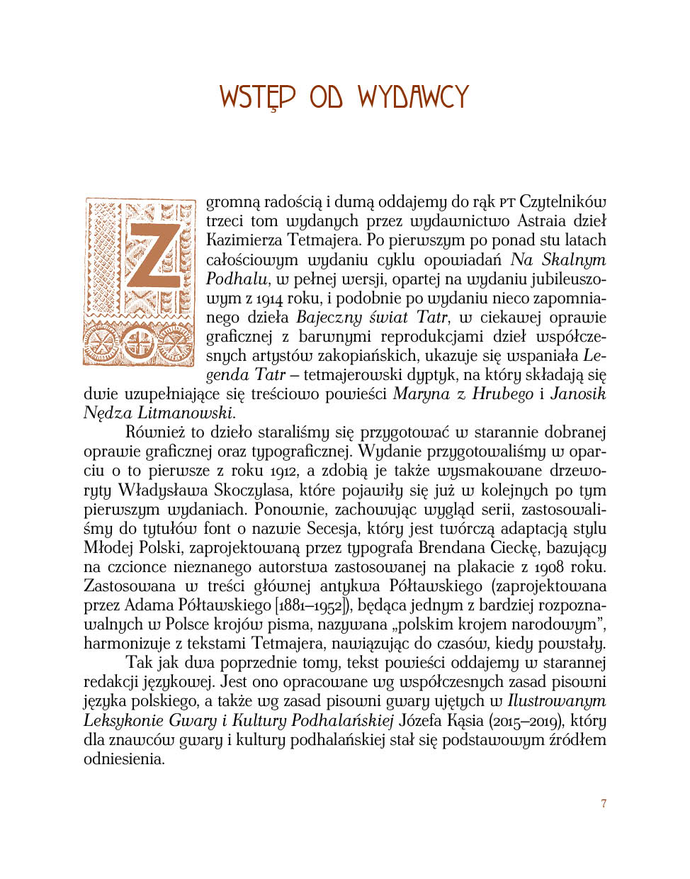 Z ogromną radością i dumą oddajemy do rąk PT Czytelników trzeci tom wydanych przez wydawnictwo Astraia dzieł Kazimierza Tetmajera. Po pierwszym po ponad stu latach całościowym wydaniu cyklu opowiadań Na Skalnym Podhalu, w pełnej wersji, opartej na wydaniu jubileuszowym z 1914 roku, i podobnie po wydaniu nieco zapomnianego dzieła Bajeczny świat Tatr, w ciekawej oprawie graficznej z barwnymi reprodukcjami dzieł współczesnych artystów zakopiańskich, ukazuje się wspaniała Legenda Tatr – tetmajerowski dyptyk, na który składają się dwie uzupełniające się treściowo powieści Maryna z Hrubego i Janosik Nędza Litmanowski.