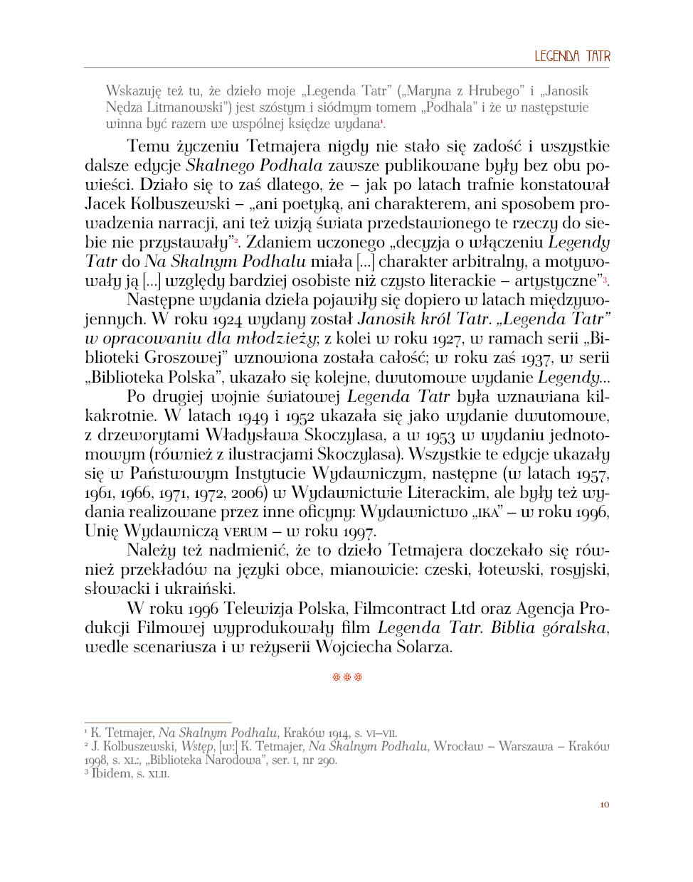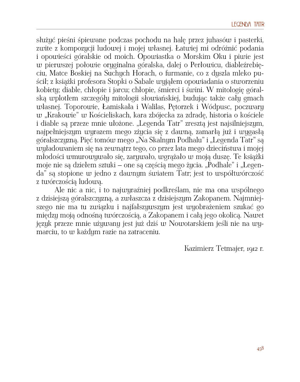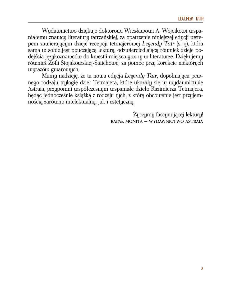 Mamy nadzieję, że ta nowa edycja „Legendy Tatr”, dopełniająca pewnego rodzaju trylogię dzieł Tetmajera, które ukazały się w wydawnictwie Astraia, przypomni współczesnym wspaniałe dzieło Kazimierza Tetmajera, będąc jednocześnie książką z rodzaju tych, z którą obcowanie jest przyjemnością zarówno intelektualną, jak i estetyczną.