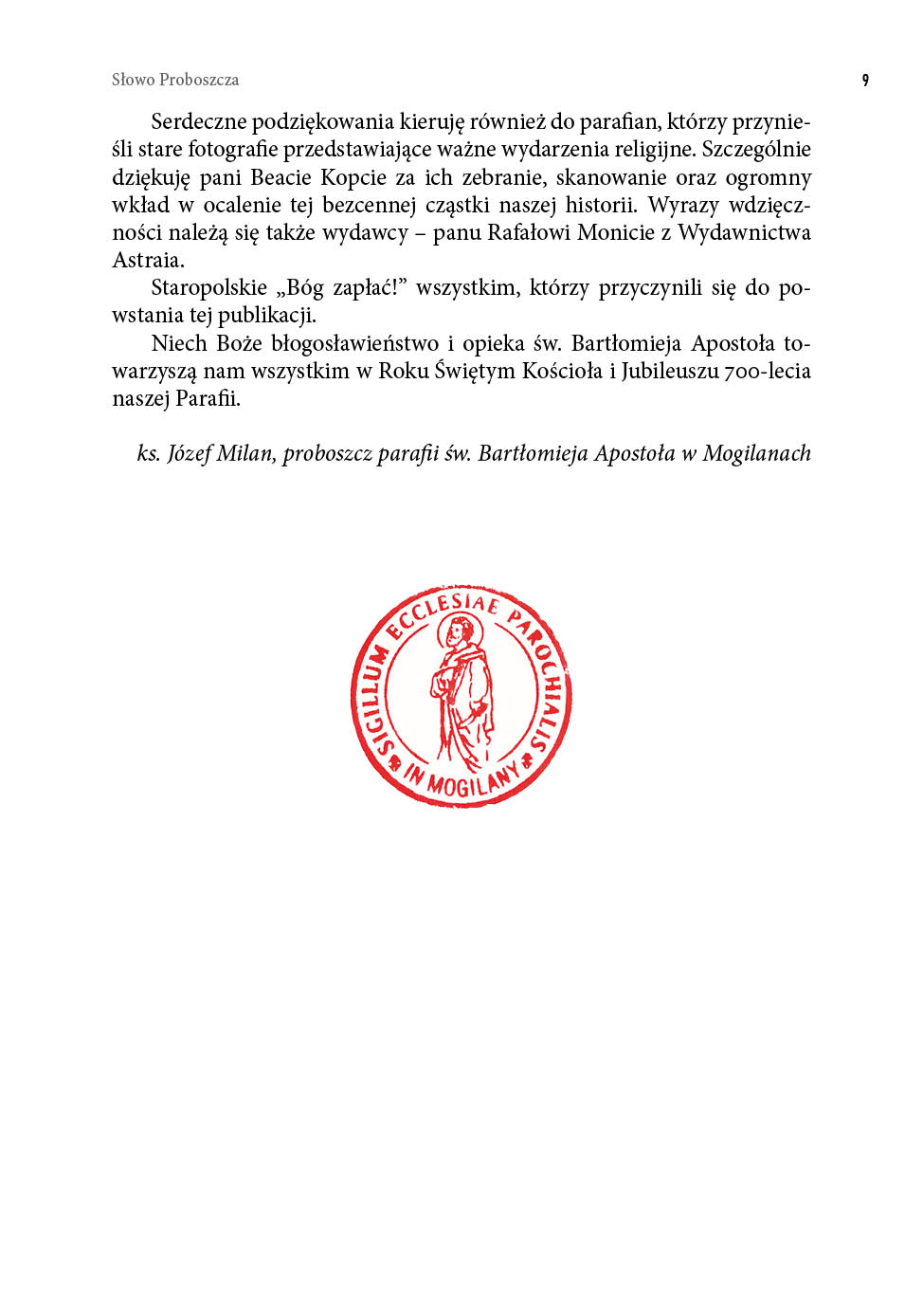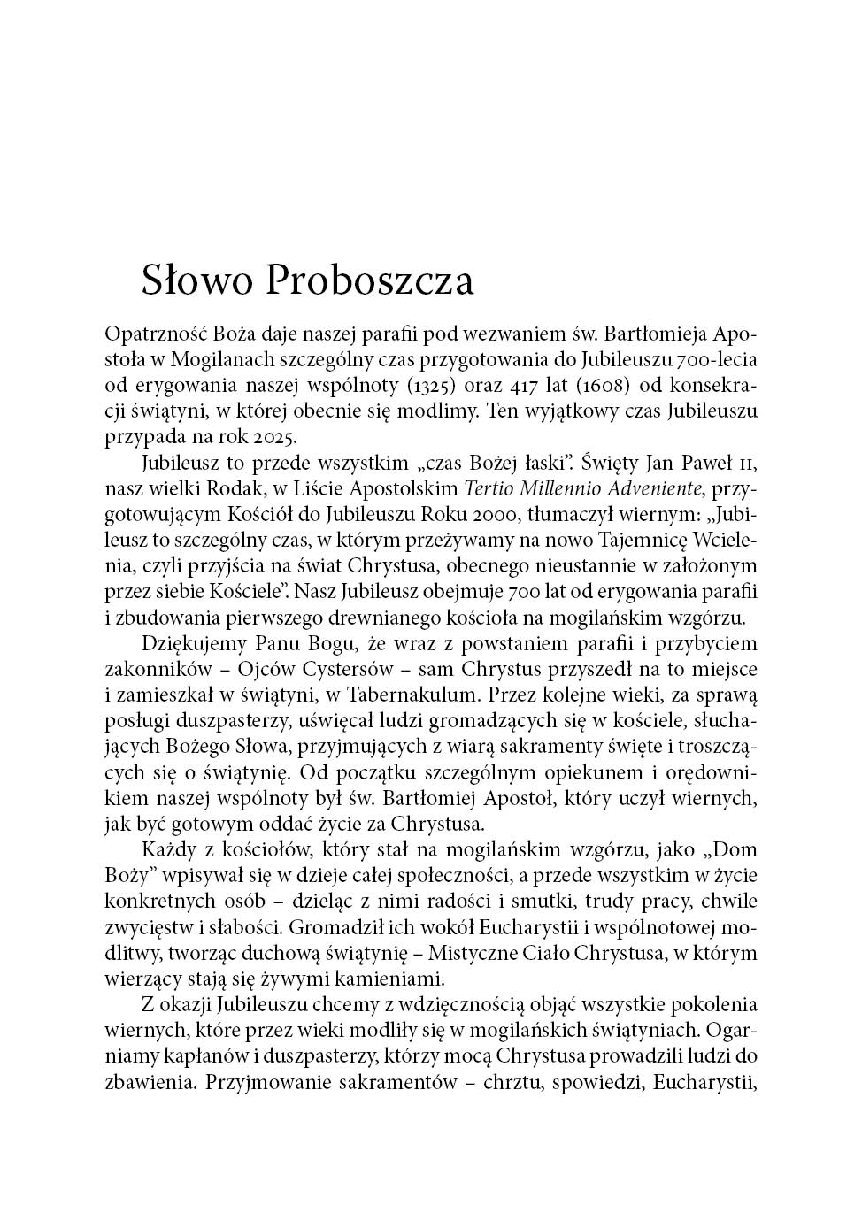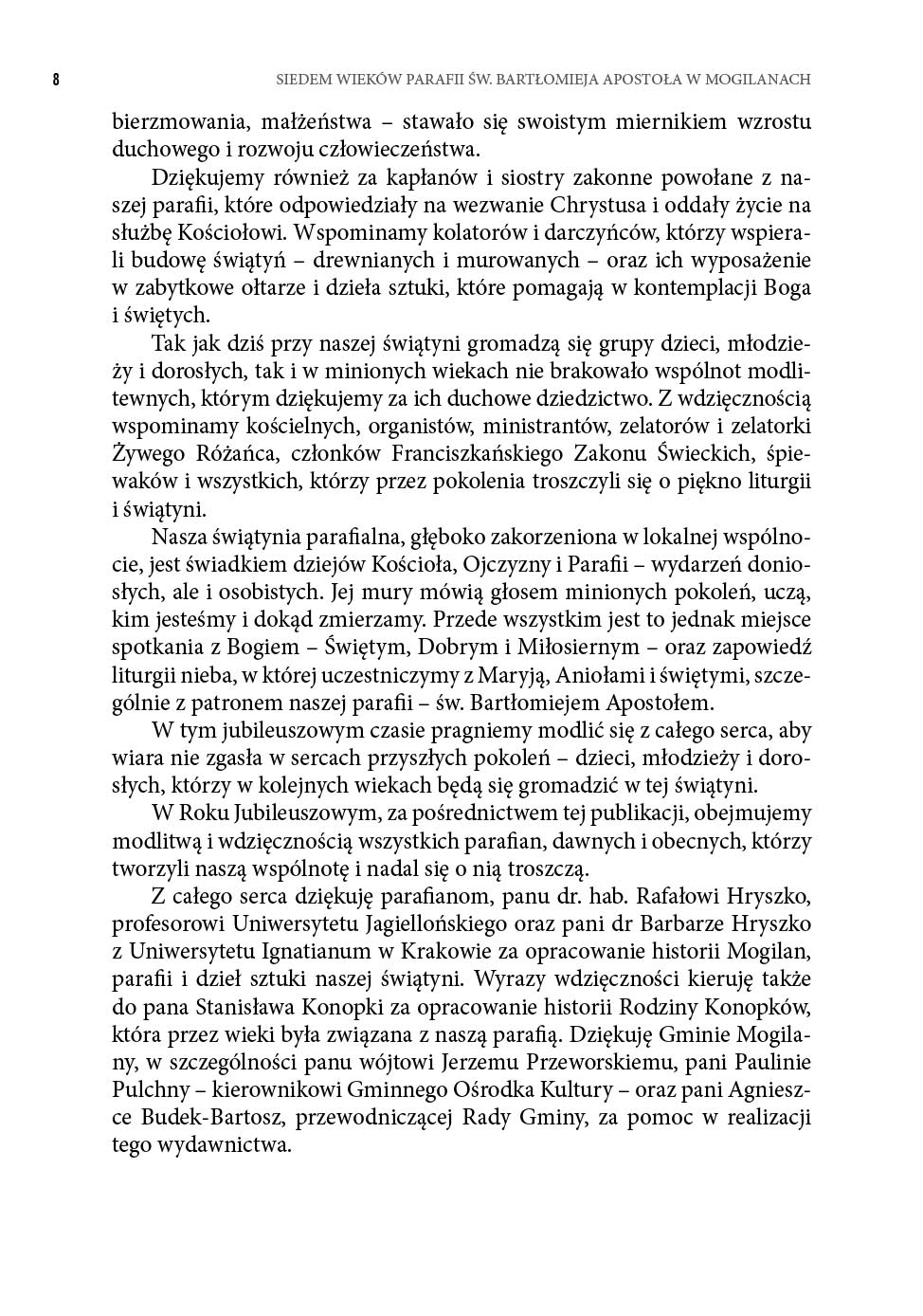 Dziękujemy również za kapłanów i siostry zakonne powołane z naszej parafii, które odpowiedziały na wezwanie Chrystusa i oddały życie na służbę Kościołowi. Wspominamy kolatorów i darczyńców, którzy wspierali budowę świątyń – drewnianych i murowanych – oraz ich wyposażenie w zabytkowe ołtarze i dzieła sztuki, które pomagają w kontemplacji Boga i świętych. Tak jak dziś przy naszej świątyni gromadzą się grupy dzieci, młodzieży i dorosłych, tak i w minionych wiekach nie brakowało wspólnot modlitewnych, którym dziękujemy za ich duchowe dziedzictwo. Z wdzięcznością wspominamy kościelnych, organistów, ministrantów, zelatorów i zelatorki Żywego Różańca, członków Franciszkańskiego Zakonu Świeckich, śpiewaków i wszystkich, którzy przez pokolenia troszczyli się o piękno liturgii i świątyni. Nasza świątynia parafialna, głęboko zakorzeniona w lokalnej wspólnocie, jest świadkiem dziejów Kościoła, Ojczyzny i Parafii – wydarzeń doniosłych, ale i osobistych. Jej mury mówią głosem minionych pokoleń, uczą, kim jesteśmy i dokąd zmierzamy. Przede wszystkim jest to jednak miejsce spotkania z Bogiem – Świętym, Dobrym i Miłosiernym – oraz zapowiedź liturgii nieba, w której uczestniczymy z Maryją, Aniołami i świętymi, szczególnie z patronem naszej parafii – św. Bartłomiejem Apostołem. W tym jubileuszowym czasie pragniemy modlić się z całego serca, aby wiara nie zgasła w sercach przyszłych pokoleń – dzieci, młodzieży i dorosłych, którzy w kolejnych wiekach będą się gromadzić w tej świątyni. W Roku Jubileuszowym, za pośrednictwem tej publikacji, obejmujemy modlitwą i wdzięcznością wszystkich parafian, dawnych i obecnych, którzy tworzyli naszą wspólnotę i nadal się o nią troszczą. Z całego serca dziękuję parafianom, panu dr. hab. Rafałowi Hryszko, profesorowi Uniwersytetu Jagiellońskiego oraz pani dr Barbarze Hryszko z Uniwersytetu Ignatianum w Krakowie za opracowanie historii Mogilan, parafii i dzieł sztuki naszej świątyni. Wyrazy wdzięczności kieruję także do pana Stanisława Konopki za opracowanie historii Rodziny Konopków, która przez wieki była związana z naszą parafią. Dziękuję Gminie Mogilany, w szczególności panu wójtowi Jerzemu Przeworskiemu, pani Paulinie Pulchny – kierownikowi Gminnego Ośrodka Kultury – oraz pani Agnieszce Budek-Bartosz, przewodniczącej Rady Gminy, za pomoc w realizacji tego wydawnictwa. Serdeczne podziękowania kieruję również do parafian, którzy przynieśli stare fotografie przedstawiające ważne wydarzenia religijne. Szczególnie dziękuję pani Beacie Kopcie za ich zebranie, skanowanie oraz ogromny wkład w ocalenie tej bezcennej cząstki naszej historii. Wyrazy wdzięczności należą się także wydawcy – panu Rafałowi Monicie z Wydawnictwa Astraia. Staropolskie „Bóg zapłać!” wszystkim, którzy przyczynili się do powstania tej publikacji.