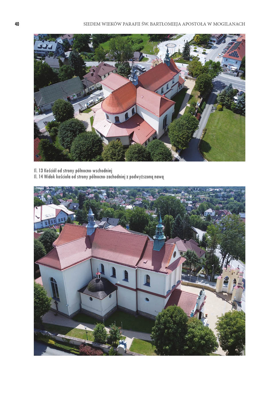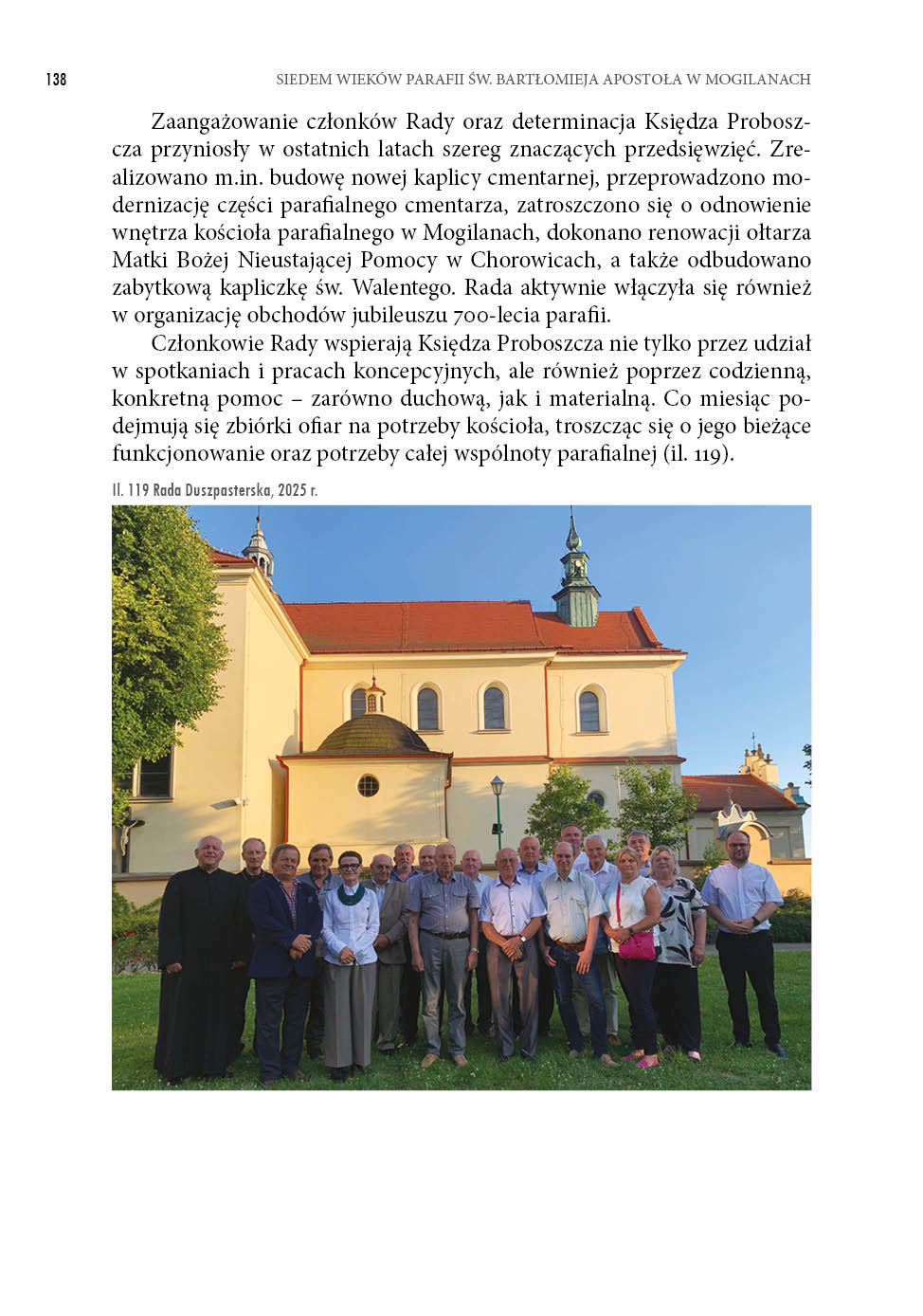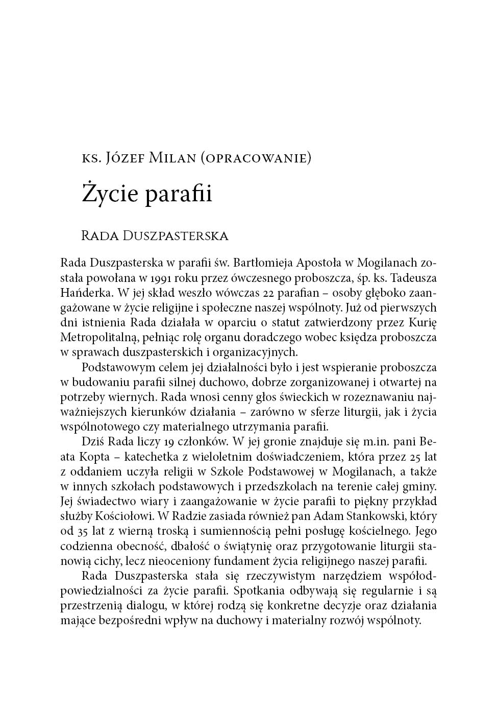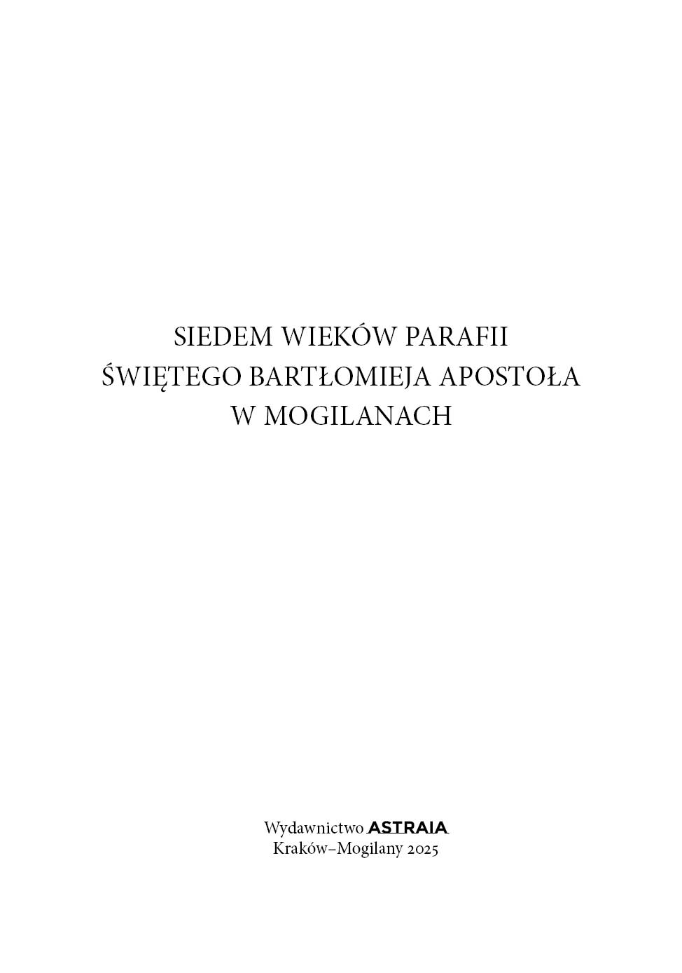 Dziękujemy również za kapłanów i siostry zakonne powołane z naszej parafii, które odpowiedziały na wezwanie Chrystusa i oddały życie na służbę Kościołowi. Wspominamy kolatorów i darczyńców, którzy wspierali budowę świątyń – drewnianych i murowanych – oraz ich wyposażenie w zabytkowe ołtarze i dzieła sztuki, które pomagają w kontemplacji Boga i świętych. Tak jak dziś przy naszej świątyni gromadzą się grupy dzieci, młodzieży i dorosłych, tak i w minionych wiekach nie brakowało wspólnot modlitewnych, którym dziękujemy za ich duchowe dziedzictwo. Z wdzięcznością wspominamy kościelnych, organistów, ministrantów, zelatorów i zelatorki Żywego Różańca, członków Franciszkańskiego Zakonu Świeckich, śpiewaków i wszystkich, którzy przez pokolenia troszczyli się o piękno liturgii i świątyni. Nasza świątynia parafialna, głęboko zakorzeniona w lokalnej wspólnocie, jest świadkiem dziejów Kościoła, Ojczyzny i Parafii – wydarzeń doniosłych, ale i osobistych. Jej mury mówią głosem minionych pokoleń, uczą, kim jesteśmy i dokąd zmierzamy. Przede wszystkim jest to jednak miejsce spotkania z Bogiem – Świętym, Dobrym i Miłosiernym – oraz zapowiedź liturgii nieba, w której uczestniczymy z Maryją, Aniołami i świętymi, szczególnie z patronem naszej parafii – św. Bartłomiejem Apostołem. W tym jubileuszowym czasie pragniemy modlić się z całego serca, aby wiara nie zgasła w sercach przyszłych pokoleń – dzieci, młodzieży i dorosłych, którzy w kolejnych wiekach będą się gromadzić w tej świątyni. W Roku Jubileuszowym, za pośrednictwem tej publikacji, obejmujemy modlitwą i wdzięcznością wszystkich parafian, dawnych i obecnych, którzy tworzyli naszą wspólnotę i nadal się o nią troszczą. Z całego serca dziękuję parafianom, panu dr. hab. Rafałowi Hryszko, profesorowi Uniwersytetu Jagiellońskiego oraz pani dr Barbarze Hryszko z Uniwersytetu Ignatianum w Krakowie za opracowanie historii Mogilan, parafii i dzieł sztuki naszej świątyni. Wyrazy wdzięczności kieruję także do pana Stanisława Konopki za opracowanie historii Rodziny Konopków, która przez wieki była związana z naszą parafią. Dziękuję Gminie Mogilany, w szczególności panu wójtowi Jerzemu Przeworskiemu, pani Paulinie Pulchny – kierownikowi Gminnego Ośrodka Kultury – oraz pani Agnieszce Budek-Bartosz, przewodniczącej Rady Gminy, za pomoc w realizacji tego wydawnictwa. Serdeczne podziękowania kieruję również do parafian, którzy przynieśli stare fotografie przedstawiające ważne wydarzenia religijne. Szczególnie dziękuję pani Beacie Kopcie za ich zebranie, skanowanie oraz ogromny wkład w ocalenie tej bezcennej cząstki naszej historii. Wyrazy wdzięczności należą się także wydawcy – panu Rafałowi Monicie z Wydawnictwa Astraia. Staropolskie „Bóg zapłać!” wszystkim, którzy przyczynili się do powstania tej publikacji.