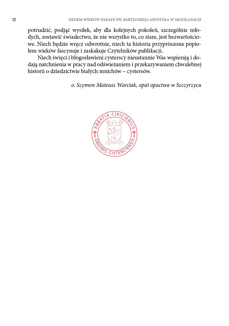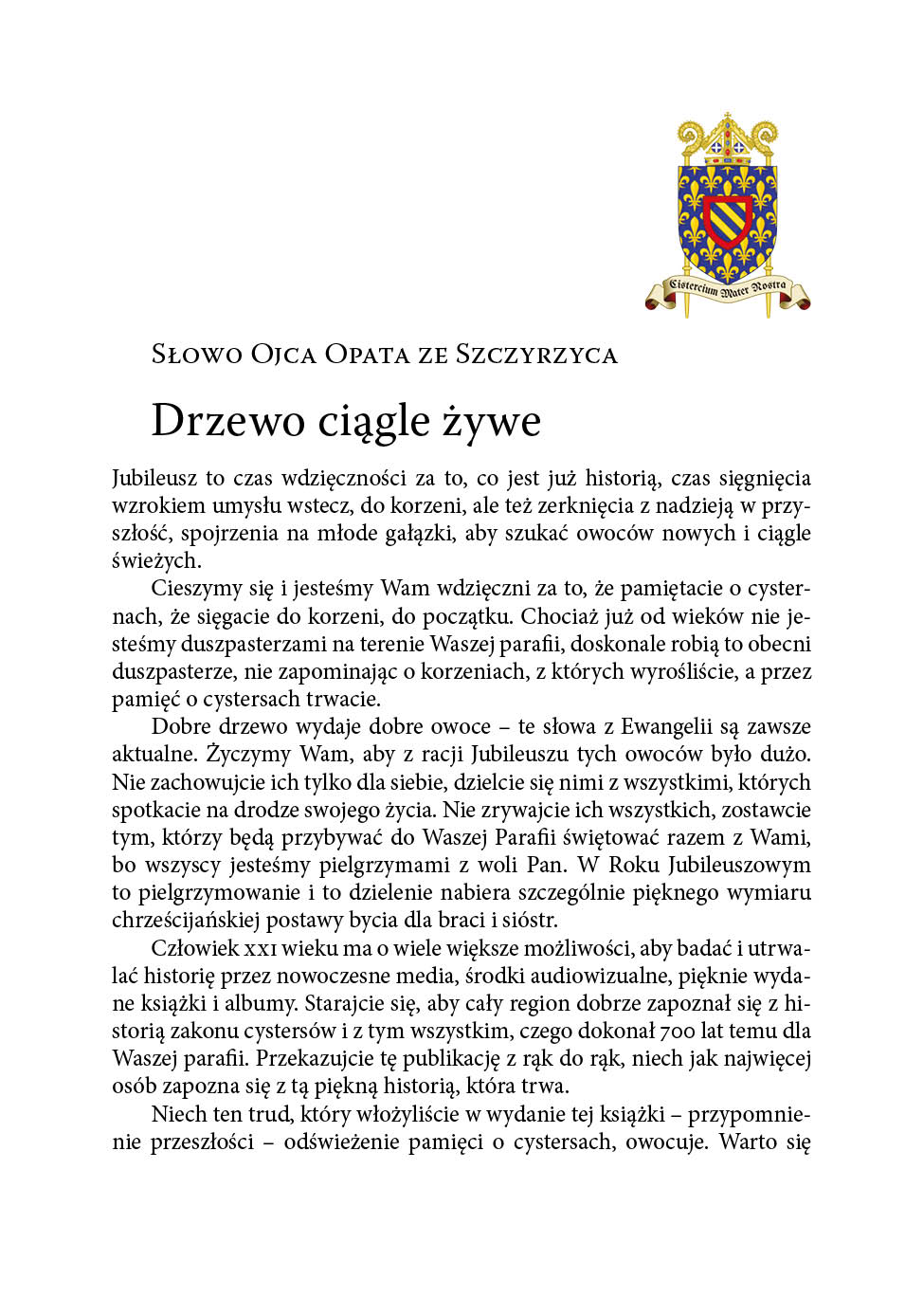 Człowiek XXI wieku ma o wiele większe możliwości, aby badać i utrwalać historię przez nowoczesne media, środki audiowizualne, pięknie wydane książki i albumy. Starajcie się, aby cały region dobrze zapoznał się z historią zakonu cystersów i z tym wszystkim, czego dokonał 700 lat temu dla Waszej parafii. Przekazujcie tę publikację z rąk do rąk, niech jak najwięcej osób zapozna się z tą piękną historią, która trwa. Niech ten trud, który włożyliście w wydanie tej książki – przypomnienie przeszłości – odświeżenie pamięci o cystersach, owocuje. Warto się potrudzić, podjąć wysiłek, aby dla kolejnych pokoleń, szczególnie młodych, zostawić świadectwo, że nie wszystko to, co stare, jest bezwartościowe. Niech będzie wręcz odwrotnie, niech ta historia przyprószona popiołem wieków fascynuje i zaskakuje Czytelników publikacji. Niech święci i błogosławieni cysterscy nieustannie Was wspierają i dodają natchnienia w pracy nad odświeżaniem i przekazywaniem chwalebnej historii o dziedzictwie białych mnichów – cystersów.